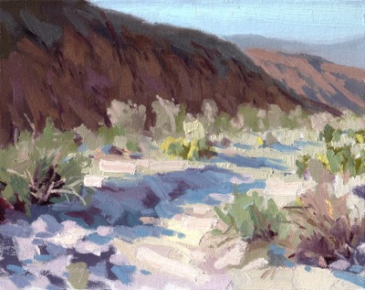 I don’t know, for some reason I’ve been drawn to desert painting lately. In looking through my reference photos, I look for images that read well with just a few large shapes. This fit the bill. I remember thinking “spots of color” (after Hawthorne), because I’m trying to forget what I”m painting and just paint the visual stimulus.